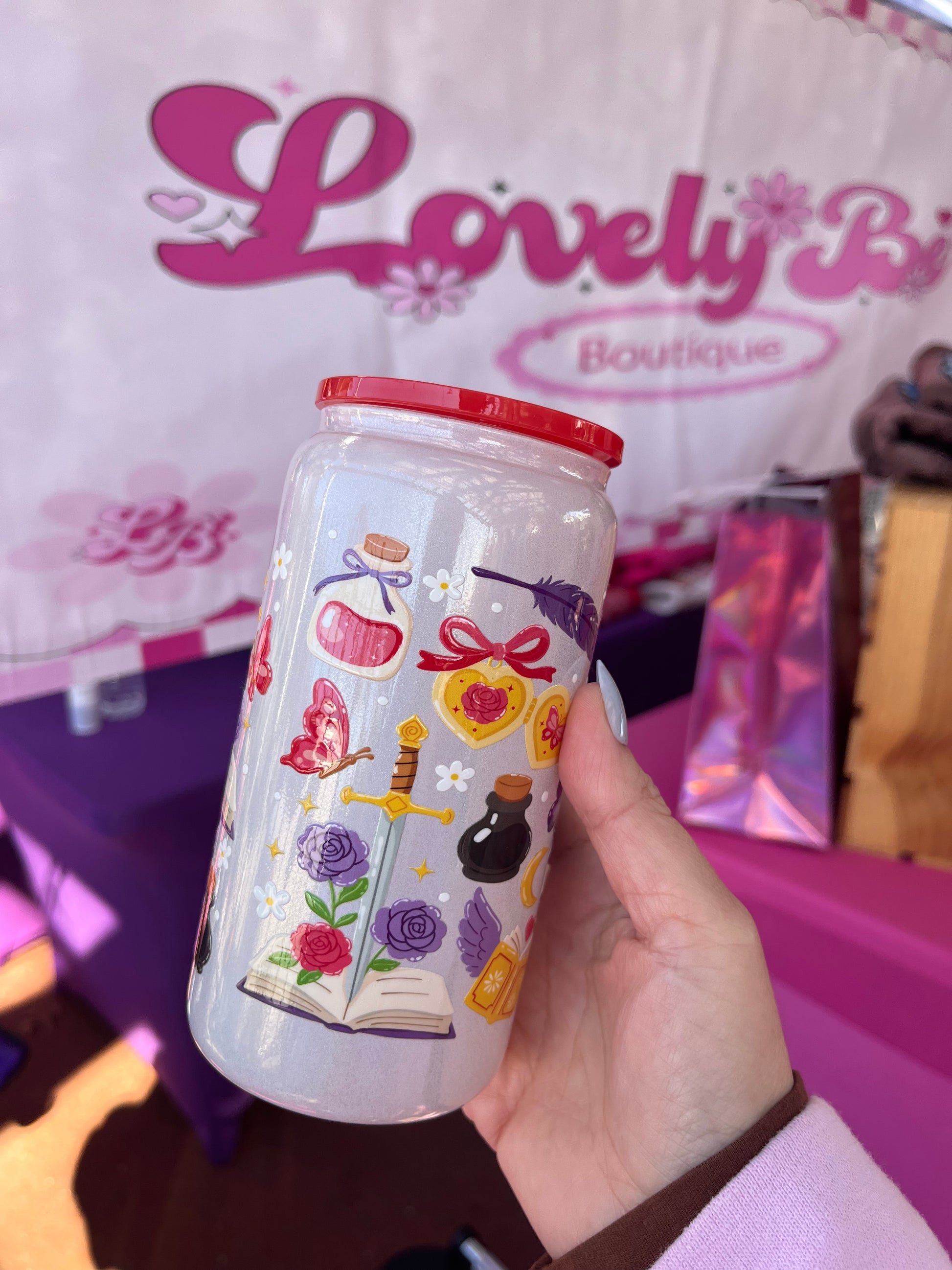 Dragons, dreams, and books glass cup